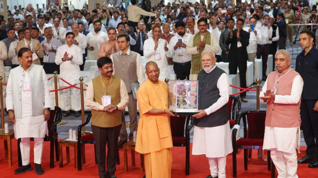 मोदी इत्यनेन उक्तं यत् भारतस्य लक्ष्यं २०४७ तमवर्षपर्यन्तं विकसितराष्ट्रं भवितुं वर्तते।वैश्विक अनिश्चिततायाः अभावेऽपि भारतं स्वस्य विकासयात्रायाः पुनः उन्मुखीकरणं कुर्वन् अस्ति। सः उद्योगं उत्तरप्रदेशे निवेशं कर्तुं, एमएसएमई-शक्तिं सदुपयोगं कर्तुं, अत्र “मेक इन इण्डिया, मेक फ़ॉर् द वर्ल्ड” इति साक्षात्कारं कर्तुं च आह्वानं कृतवान्।