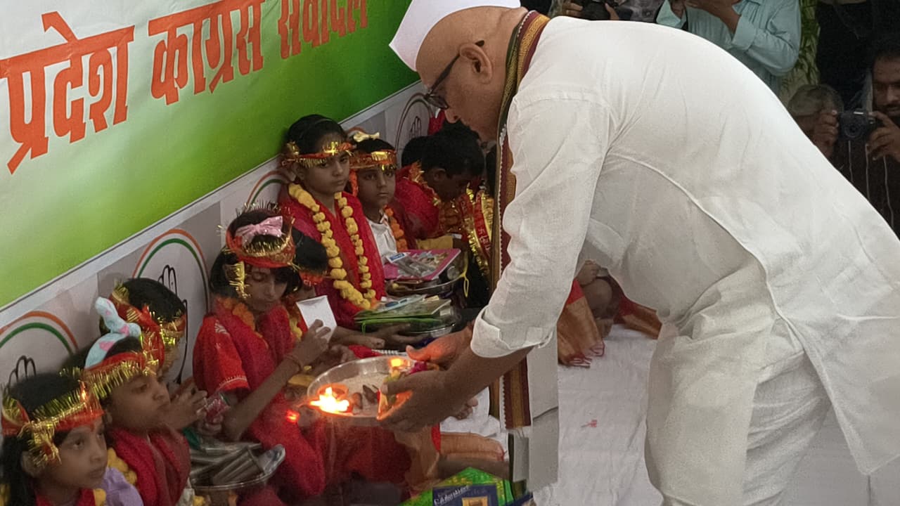 नवरात्रोৎসवे कांग्रेसपक्षीयकार्यालये कन्यापूजनं सम्पन्नम्। प्रदेशाध्यक्षः अजय राय नामकः कन्यानां पादौ पखार्य भोजनं प्रावर्तयत्।